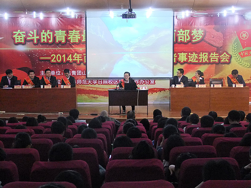 4月25日下午,日照校区图书馆报告厅座无虚席,掌声阵阵,由共青团山东省委志愿者工作部主办、万象城手机网页版登录入口日照校区学生工作办公室承办的“奋斗的青春最美丽·炫我西部梦”——2014年西部计划优秀志愿者事迹报告会在这里隆重举行。共青团新疆维吾尔自治区委志愿者工作部部长李鑫,共青团山东省委志愿者行动指导中心综合部副部长陈宝军,万象城手机网页版登录入口日照校区机关党总支书记、学生工作办公室主任孔令军、各院系团总支书记以及学生代表认真聆听了报告。