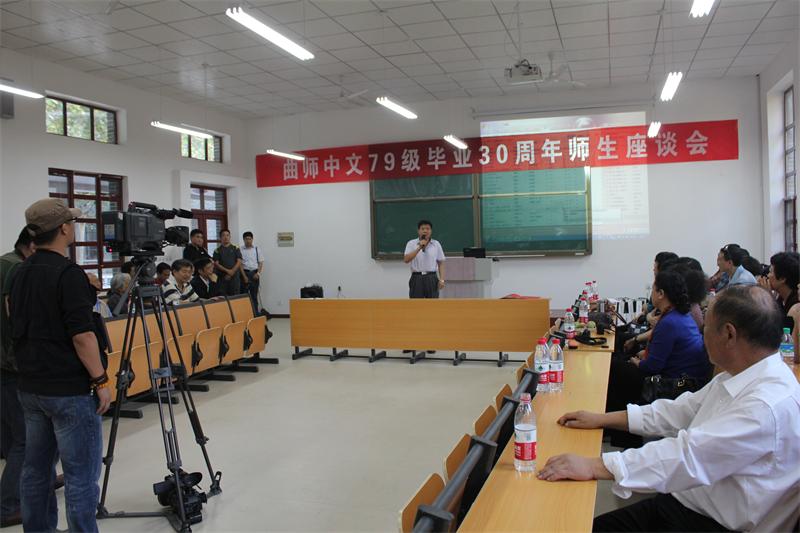 10月5日下午,师生座谈会在整饬一新的西联三教室举行,这里曾是他们当年的教室,校友们纷纷寻觅当年的座位,叙说当年的故事。洁白的墙壁上张贴着三幅长联“洙泗河边同窗好友把酒滔滔忆当年 杏坛阶下尊师亲朋弦歌阵阵话明天”“齐鲁精英金风一夜汇圣城 路漫漫其修远兮 华夏志士同窗四载各东西 吾将上下而求索”“灼灼兮华矣风咏舞雩台继学立心 郁郁乎文哉吾从曲师院启智灌顶”。 党委副书记刘新生、文学院领导、中文系79级的部分任教老师来到了聚会现场。刘新生、文学院院长单承彬、79级任课教师邓承奇分别致辞。