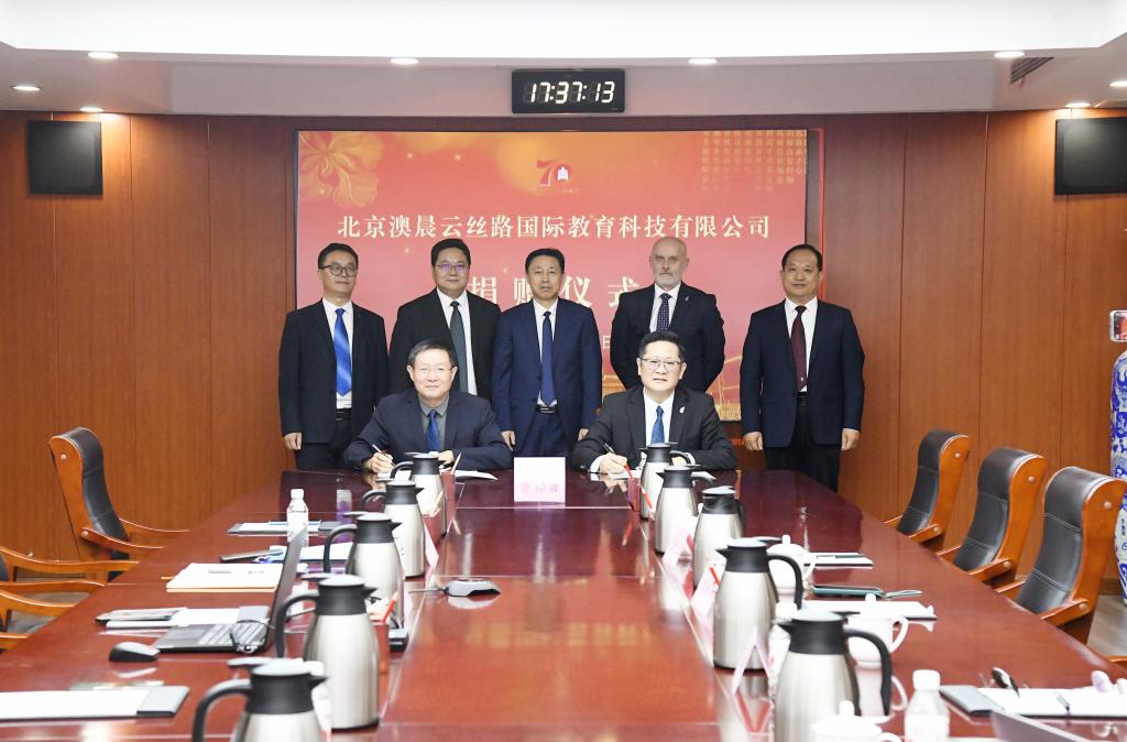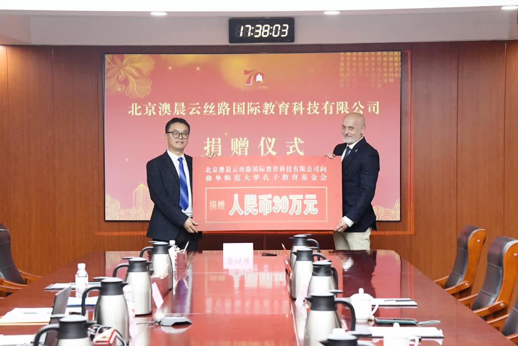 国际交流合作处讯 6月24日,北京澳晨云丝路国际教育科技有限公司捐赠仪式在曲阜师大举行,学校党委副书记、校长张洪海,澳晨云丝路国际教育科技有限公司董事长、AEMG教育集团总裁李新庆出席仪式。