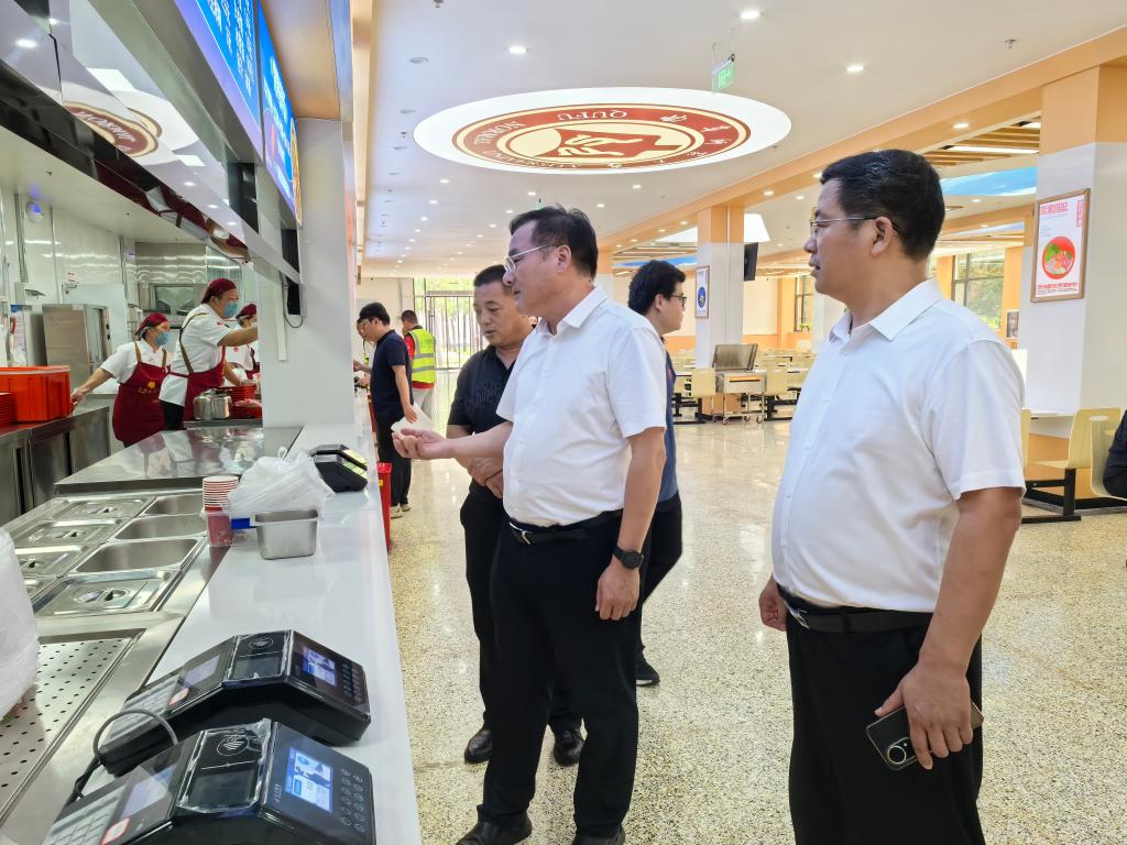 陈刚重点检查了学二食堂一楼和教工食堂的开餐品种类、原材料采购管理、食堂菜品价格、教工餐厅外售点等情况,并对新学期食堂工作提出要求,他指出,一是要压实主体责任,严格履行食品安全要求,确保食品来源可追溯、质量可控;二是优化就餐环境,提升从业人员服务意识与技能水平,营造温馨舒适的就餐氛围;三是加强师生意见收集与反馈机制,及时调整菜品结构,满足师生多样化需求。他着重强调了推动食堂“互联网+明厨亮灶”运行的重要性,要求通过实时监控确保操作流程透明化,杜绝食品安全隐患,切实保障校园餐饮服务工作安全有序运行。