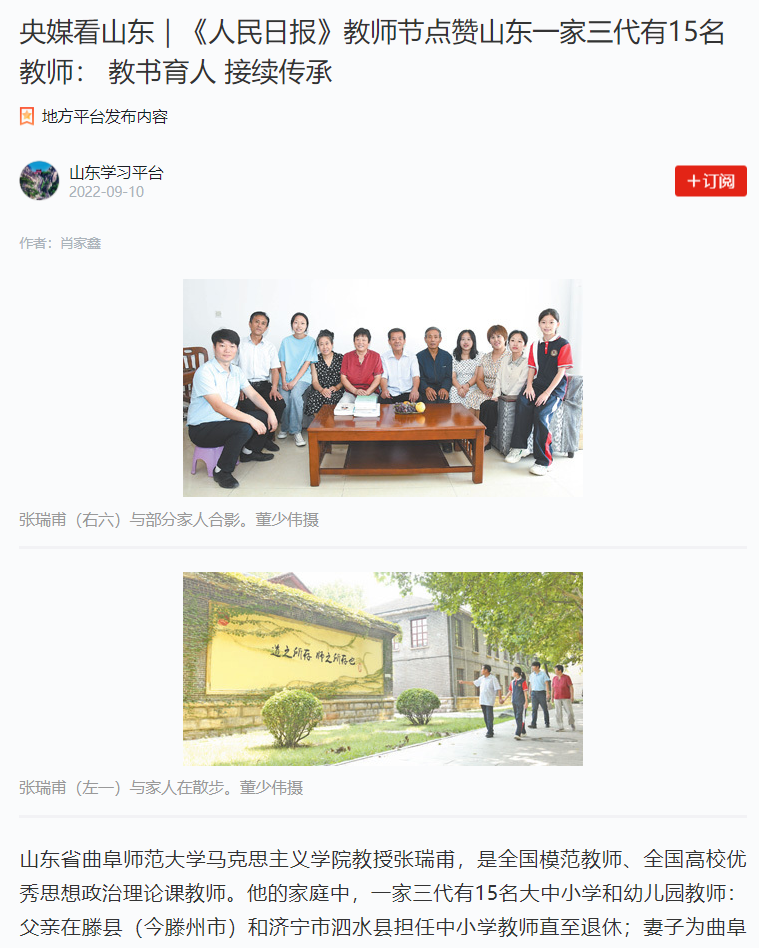 【学习强国山东】《人民日报》教师节点赞山东一家三代有15名教师: 教书育人 接续传承