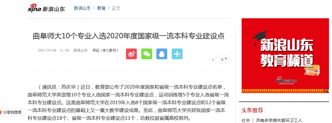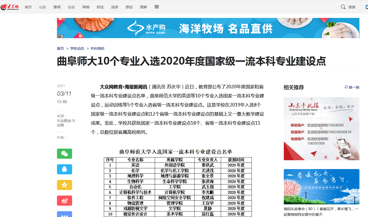 大众网:曲阜师大10个专业入选2020年度国家级一流本科专业建设点