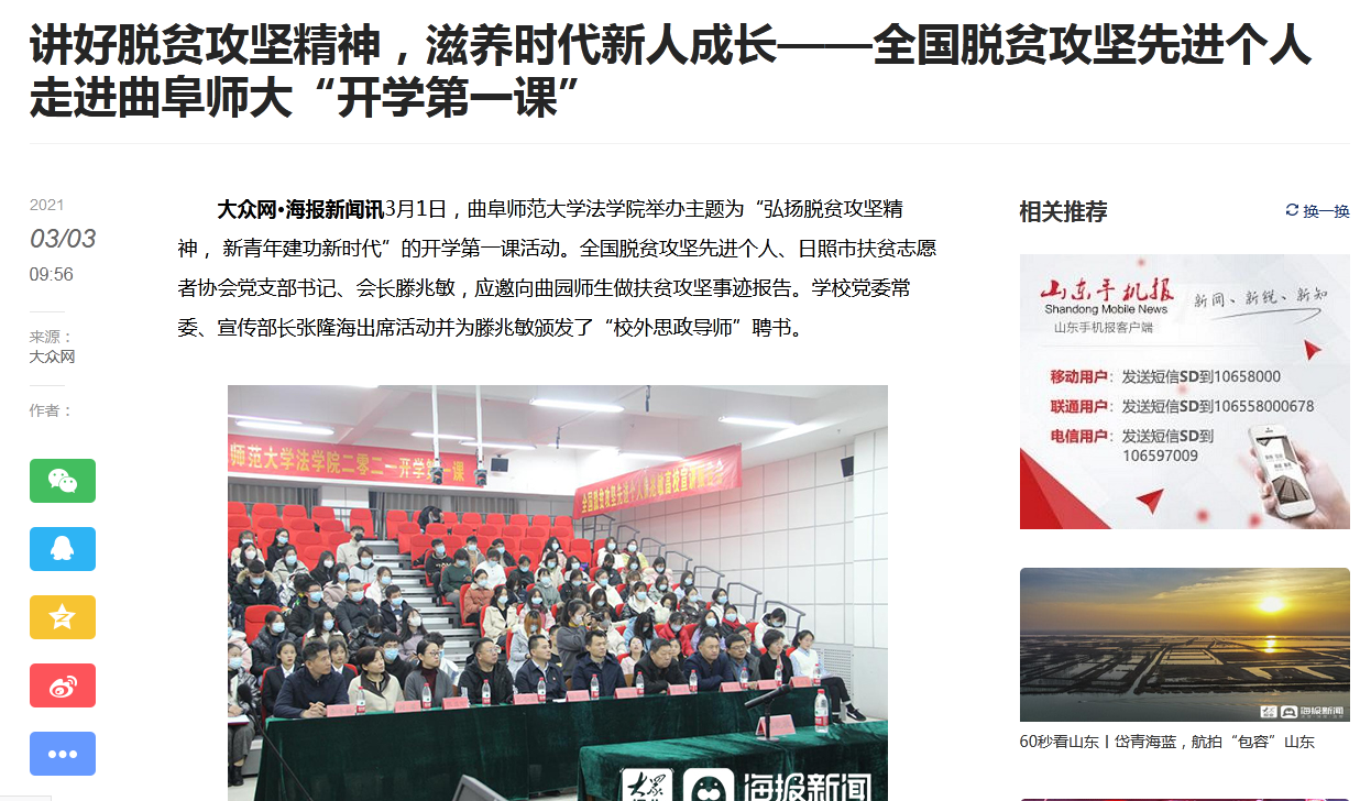 大众网:全国脱贫攻坚先进个人走进曲阜师大“开学第一课”