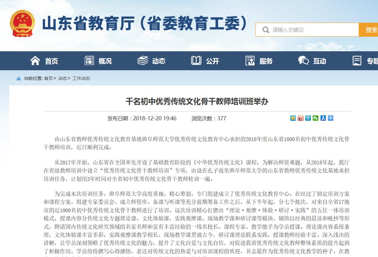 山东省教育厅:曲师大举办千名初中优秀传统文化骨干教师培训班