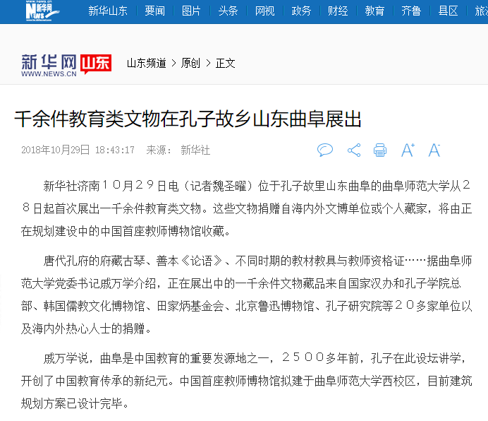 新华社:千余件教育类文物在孔子故乡山东曲阜展出