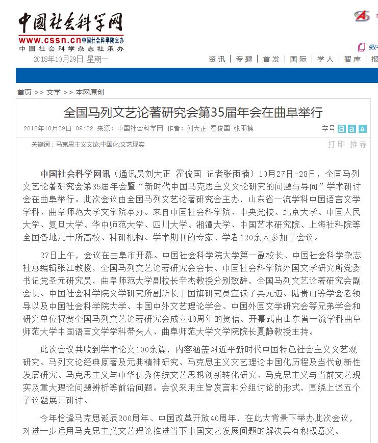 中国社会科学网:全国马列文艺论著研究会第35届年会在曲阜举行