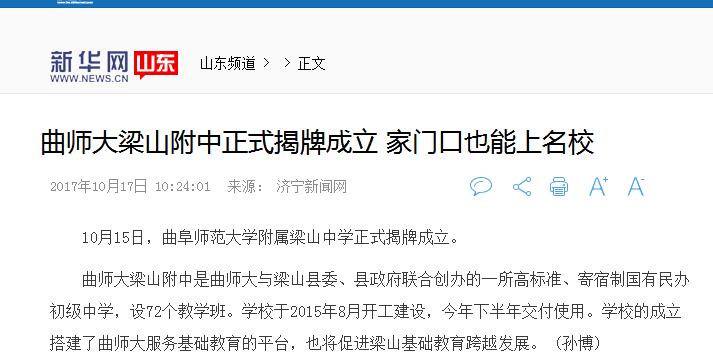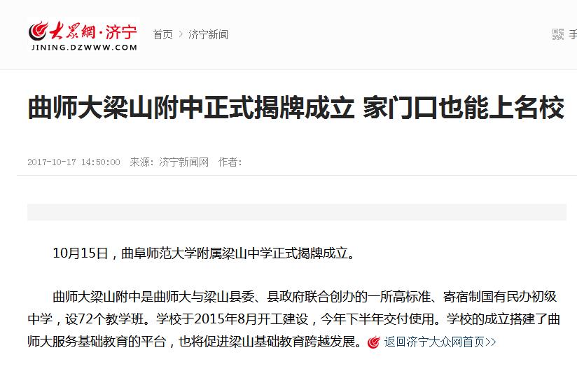 大众网:曲师大梁山附中正式揭牌成立 家门口也能上名校
