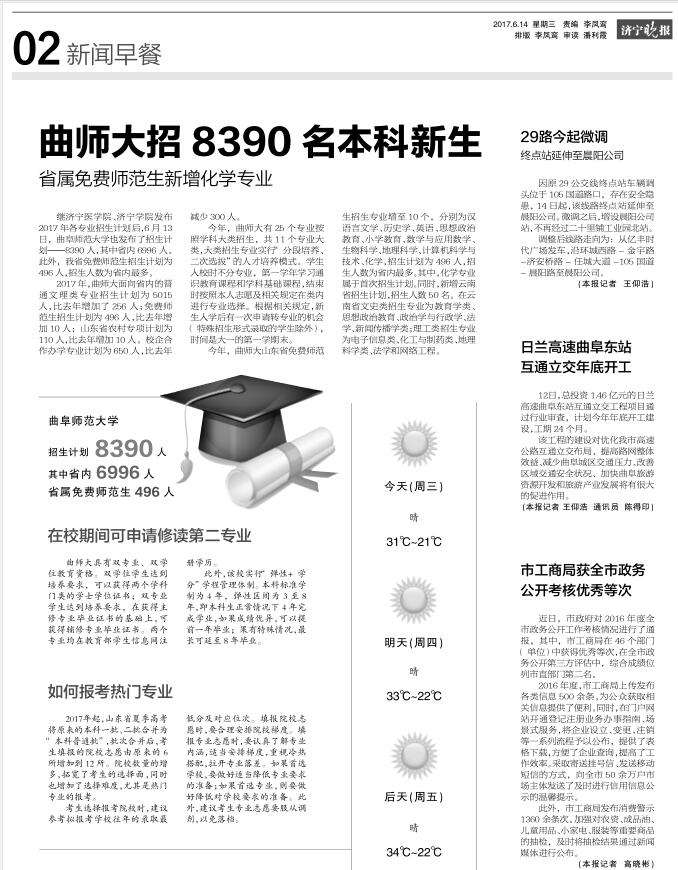 济宁晚报:曲师大招8390名本科新生 省属免费师范生新增化学专业
