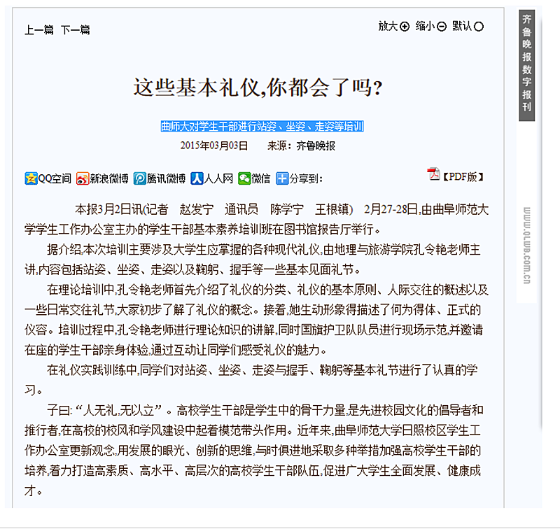 齐鲁晚报:曲师大对学生干部进行站姿、坐姿、走姿等培训