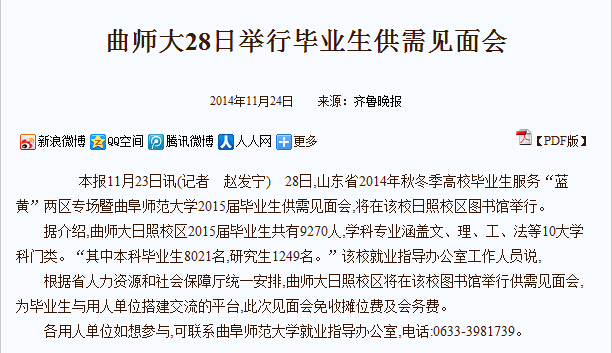 齐鲁晚报:曲师大28日举行毕业生供需见面会