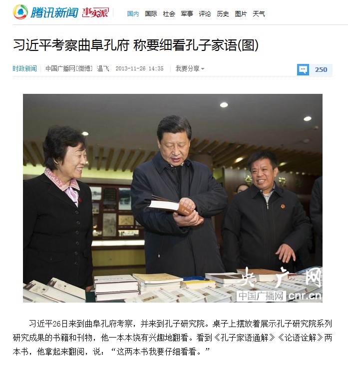 腾讯新闻:习近平考察曲阜孔府 称要细看孔子家语