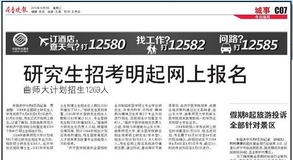 齐鲁晚报:研究生招考明起网上报名 曲师大计划招生1269人