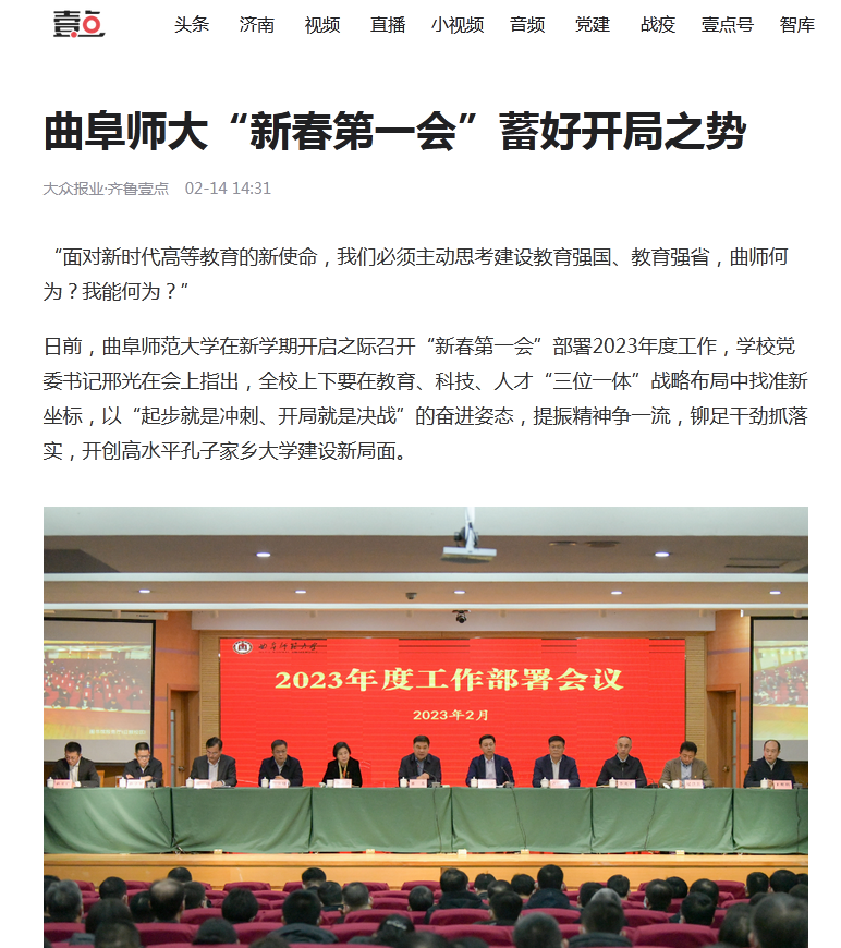 日前,万象城手机网页版登录入口在新学期开启之际召开“新春第一会”部署2023年度工作,学校党委书记邢光在会上指出,全校上下要在教育、科技、人才“三位一体”战略布局中找准新坐标,以“起步就是冲刺、开局就是决战”的奋进姿态,提振精神争一流,铆足干劲抓落实,开创高水平孔子家乡大学建设新局面。