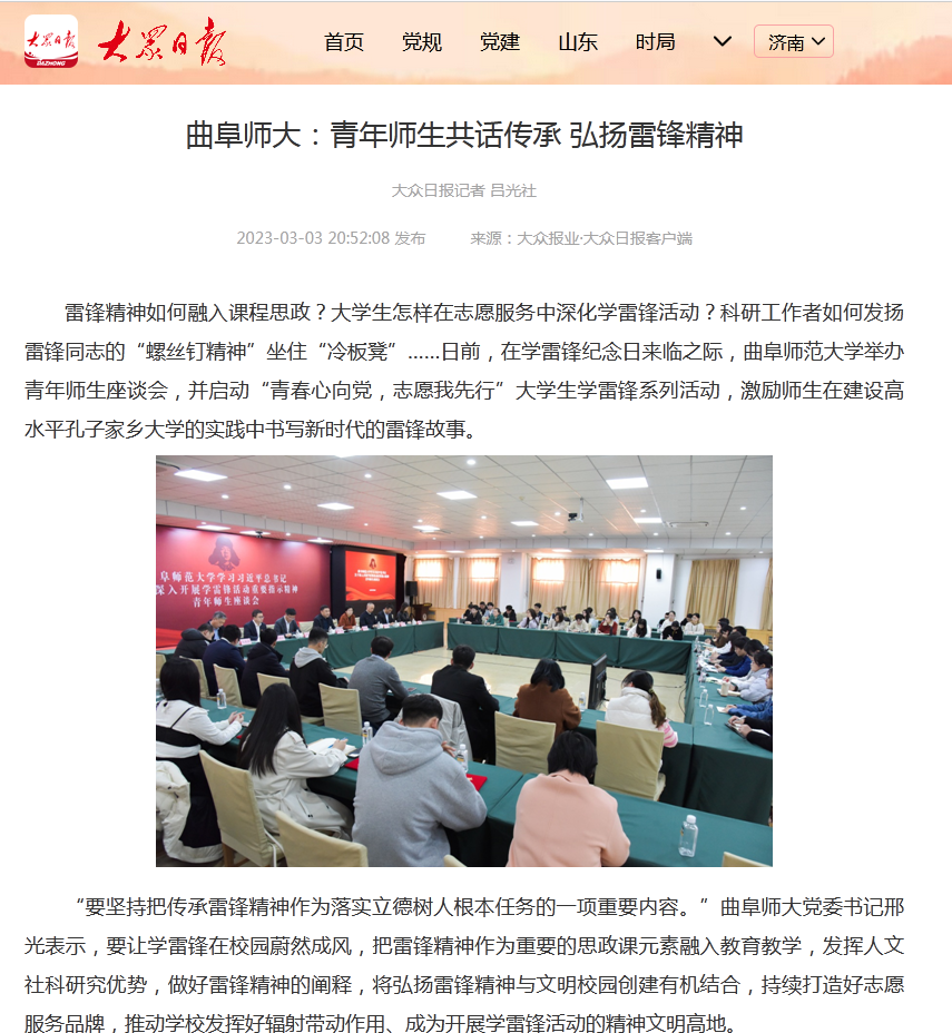 雷锋精神如何融入课程思政?大学生怎样在志愿服务中深化学雷锋活动?科研工作者如何发扬雷锋同志的“螺丝钉精神”坐住“冷板凳”……日前,在学雷锋纪念日来临之际,万象城手机网页版登录入口举办青年师生座谈会,并启动“青春心向党,志愿我先行”大学生学雷锋系列活动,激励师生在建设高水平孔子家乡大学的实践中书写新时代的雷锋故事。