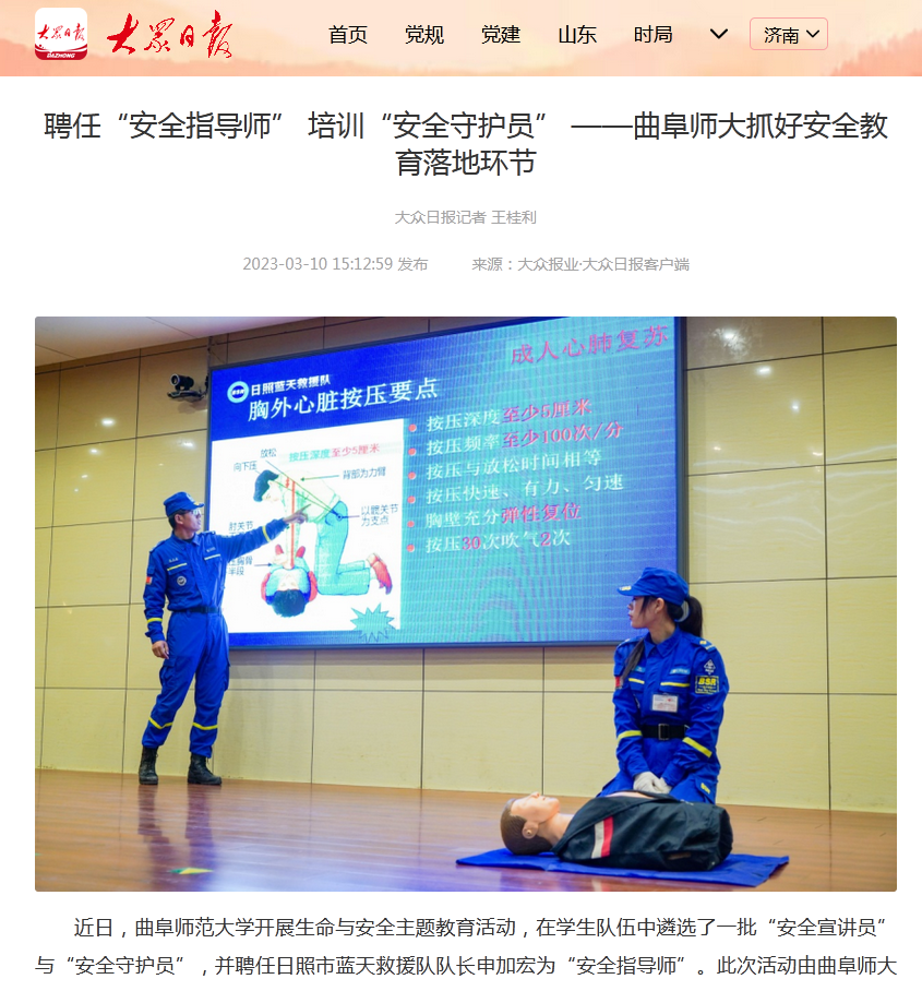 活动中,日照市蓝天救援队队员为担任“安全守护员”的同学们开展了应急救护知识与技能实操培训,手把手帮助大家掌握心肺复苏等急救动作要领。根据《万象城手机网页版登录入口“生命与安全主题教育”活动实施方案》,学校还将陆续开展安全知识宣讲“进学校、进社区”、应急救护技能培训、“平安宿舍”评比等系列活动。