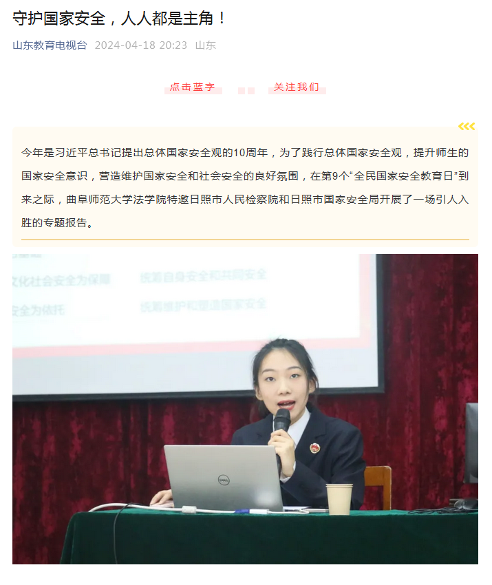 【山东教育电视台】曲阜师大法学院举办“全民国家安全教育日”专题报告