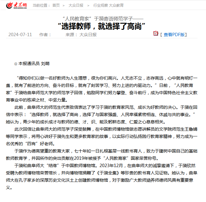 【大众日报】“人民教育家”于漪寄语曲师师范学子——“选择教师,就选择了高尚”