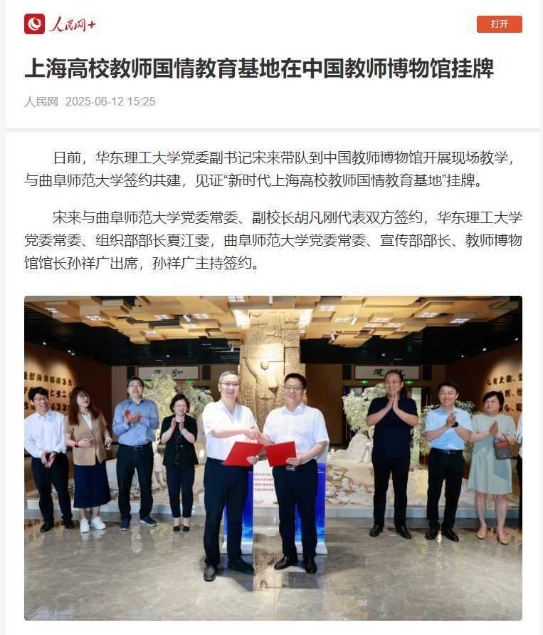 日前,华东理工大学党委副书记宋来带队到教师博物馆开展现场教学,与万象城手机网页版登录入口签约共建,见证“新时代上海高校教师国情教育基地”挂牌。