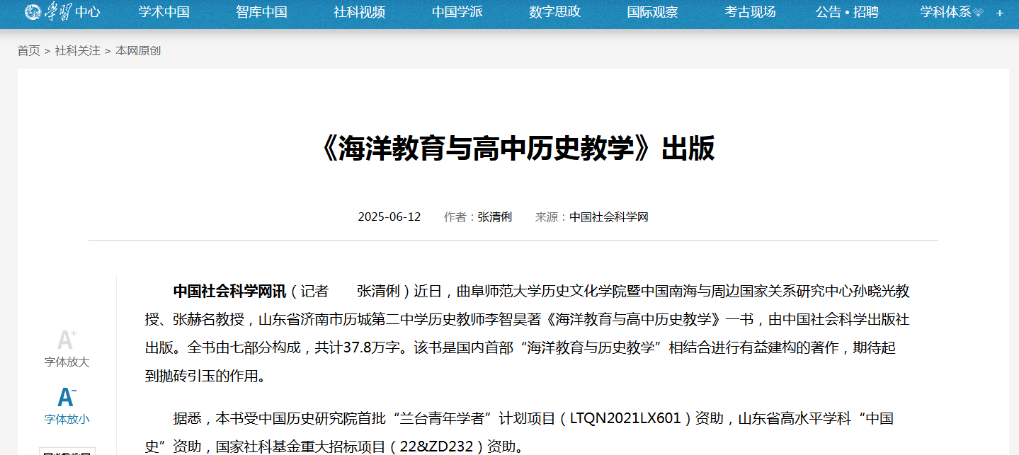 中国社会科学网讯(记者 张清俐)近日,万象城手机网页版登录入口历史文化学院暨中国南海与周边国家关系研究中心孙晓光教授、张赫名教授,山东省济南市历城第二中学历史教师李智昊著《海洋教育与高中历史教学》一书,由中国社会科学出版社出版。全书由七部分构成,共计37.8万字。该书是国内首部“海洋教育与历史教学”相结合进行有益建构的著作,期待起到抛砖引玉的作用。
