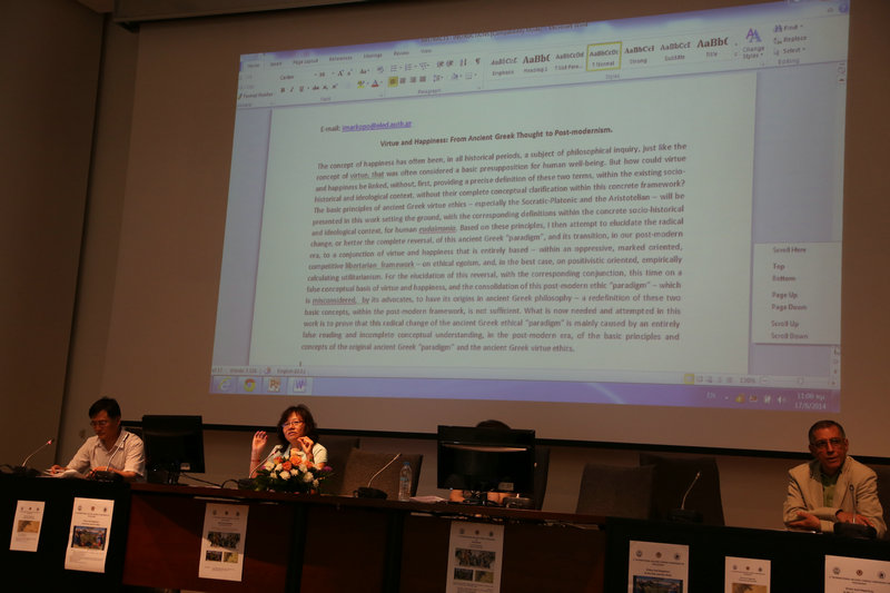 6月15-17日,由我校与希腊亚里士多德大学、希腊“哲学研究”杂志社共同主办的第一届中国-希腊哲学国际学术研讨会在希腊塞萨洛尼基的亚里士多德大学举行。会议的主题是“道德与幸福—在东方与西方”。来自中国、美国、英国、德国、塞浦路斯、中国香港等国家和地区的近20所大学和研究机构的40余名代表以及亚洲与比较哲学协会(Society for Asian and Comparative Philosophy)的会长安乐哲、副会长王蓉蓉等参加了会议。