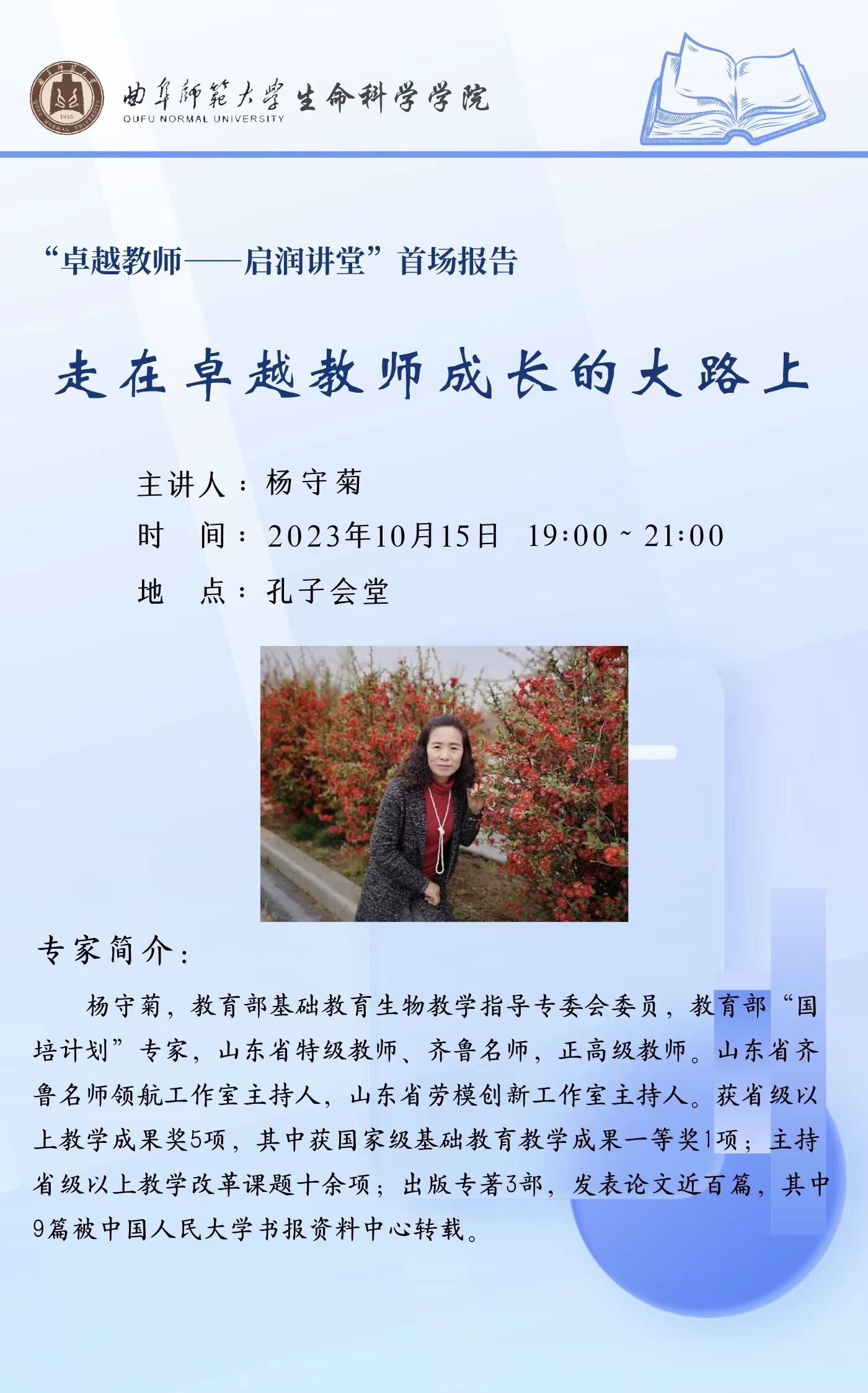 生命科学学院“卓越教师——启润讲堂”首场报告预告|杨守菊:走在卓越教师成长的大路上