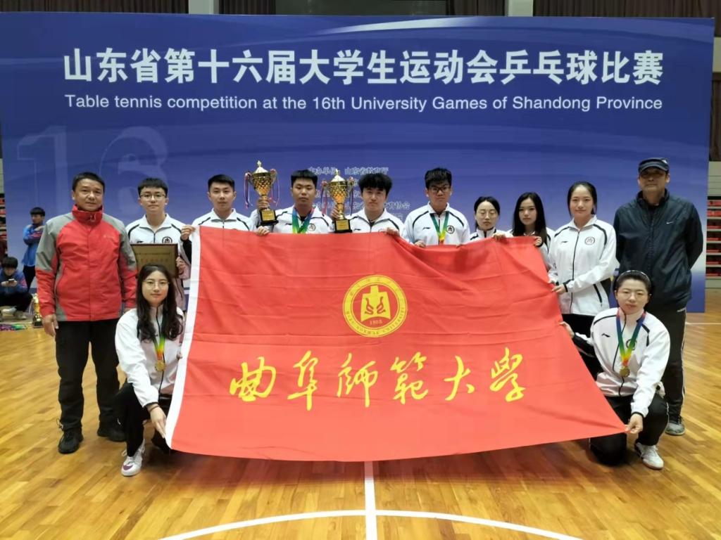 曲阜师大新闻中心讯 11月30日至12月5日,由山东省教育厅、山东省体育局主办,山东大学承办的山东省第十六届大学生运动会乒乓球比赛在青岛职业技术学院举行。本届比赛共设甲、乙、丙三个组别,来自全省各高校49支队伍600余人参加了各组比赛,赛事规模创造历史新高。经过6天紧张激烈的比赛,我校乒乓健儿取得甲组混合双打冠军、女子双打冠军两枚金牌,甲组团体总分第四名和丙组团体总分第六名的好成绩,并荣获体育道德风尚奖,取得体育竞技和精神文明的双丰收。