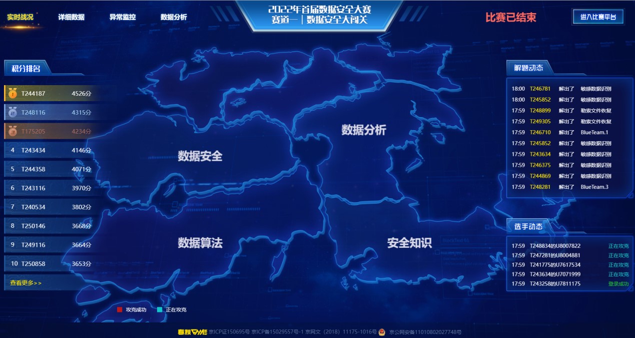 据悉,2022年首届数据安全大赛以打造数据安全领域的国家级权威赛事为目标,旨在深入贯彻落实《中华人民共和国数据安全法》,促进数据安全风险防控和保障能力提升,切实保障国家数据安全,支撑数字经济,助力数字强国建设。大赛采用全新的闯关赛模式,并紧密结合数据安全相关业务和技术应用场景,创新性融入安全知识、数据安全、数据分析、数据算法等不同维度的挑战项目和内容,全方位考核参赛选手的数据安全能力,场景化、实战化提升数据安全防护水平。晋级全国百强的队伍来自中国电信、国家电网等各行业领域单位,中兴、腾讯等专业技术公司,哈尔滨工业大学、北京邮电大学、电子科技大学、大连理工大学、华南理工大学、万象城手机网页版登录入口等高校以及公安、海事、税务、气象等有关政府部门。