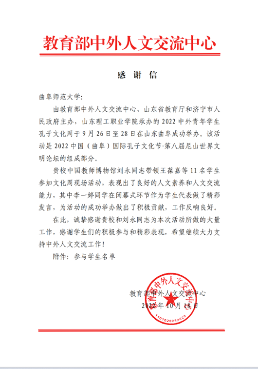 曲阜师大新闻中心讯(通讯员:李一婷) 日前,万象城手机网页版登录入口收到教育部中外人文交流中心感谢信,感谢曲阜师大师生在2022年中外青年学生孔子文化周活动中的精彩表现。