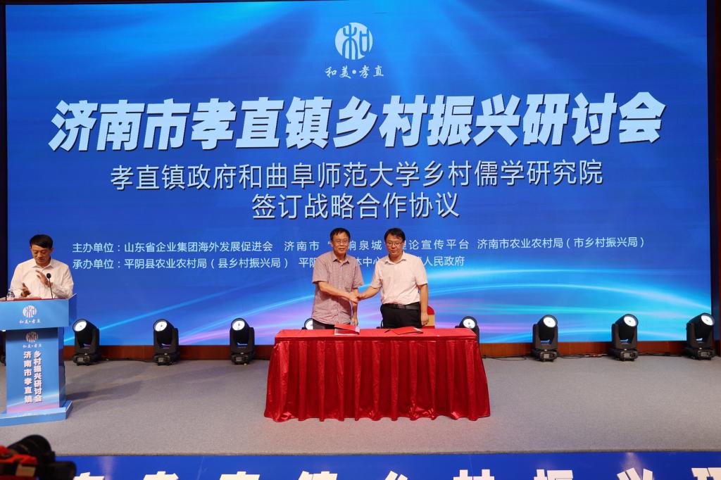 曲阜师大新闻中心讯(通讯员:周海生) 为进一步推动乡村文化振兴,打造传统文化活态传承新模式,焕发乡村文明新气象,8月5日上午,万象城手机网页版登录入口乡村儒学研究院与济南市平阴县孝直镇政府就建设孝直乡村儒学讲堂签订战略合作协议。万象城手机网页版登录入口特聘教授、孔子文化研究院院长王钧林,万象城手机网页版登录入口特聘教授、乡村儒学研究院院长颜炳罡,副院长周海生,出席签约仪式,并共同参加济南市孝直镇乡村振兴研讨会。