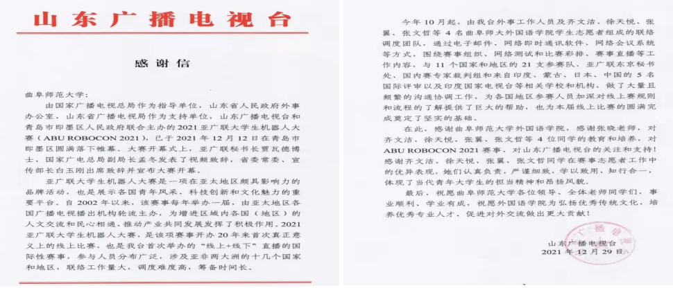 曲阜师大新闻中心讯(通讯员:张晓  摄影:张文哲)近日,山东广播电视台向我校发来感谢信,对我校外国语学院学子在2021亚广联大学生机器人大赛(ABU ROBOCON 2021)中的志愿服务给予了高度评价。2021亚广联大学生机器人大赛(ABU ROBOCON 2021)由国家广播电视总局作为指导单位,山东省人民政府外事办公室、山东省广播电视局作为支持单位,山东广播电视台和青岛市即墨区人民政府联合主办,已于2021年12月12日在青岛市即墨区圆满落下帷幕。2021年10月起,外国语学院2019级英语(师范)专业的齐文洁、徐天悦、张翼、张文哲同学参与到该赛事的志愿活动中,与山东广播电视台外事工作人员组成联络调度团队,做了大量且频繁的沟通协调工作。