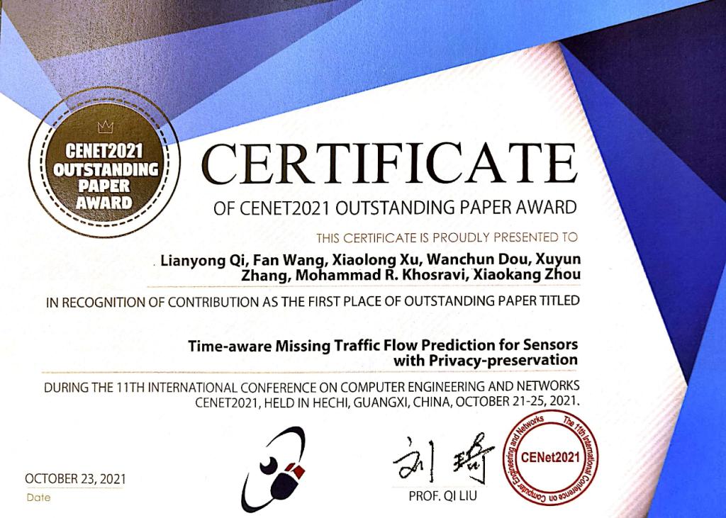 曲阜师大新闻中心讯(通讯员:孙宇)近日,第11届计算机工程与网络国际会议(the 11th International Conference on Computer Engineering and Networks, CENet2021)于中国河池召开,我校计算机学院青年教授齐连永的论文“Time-aware Missing Traffic Flow Prediction for Sensors with Privacy-preservation”在本次会议中获得最佳论文奖(The First Place of Outstanding Paper)。