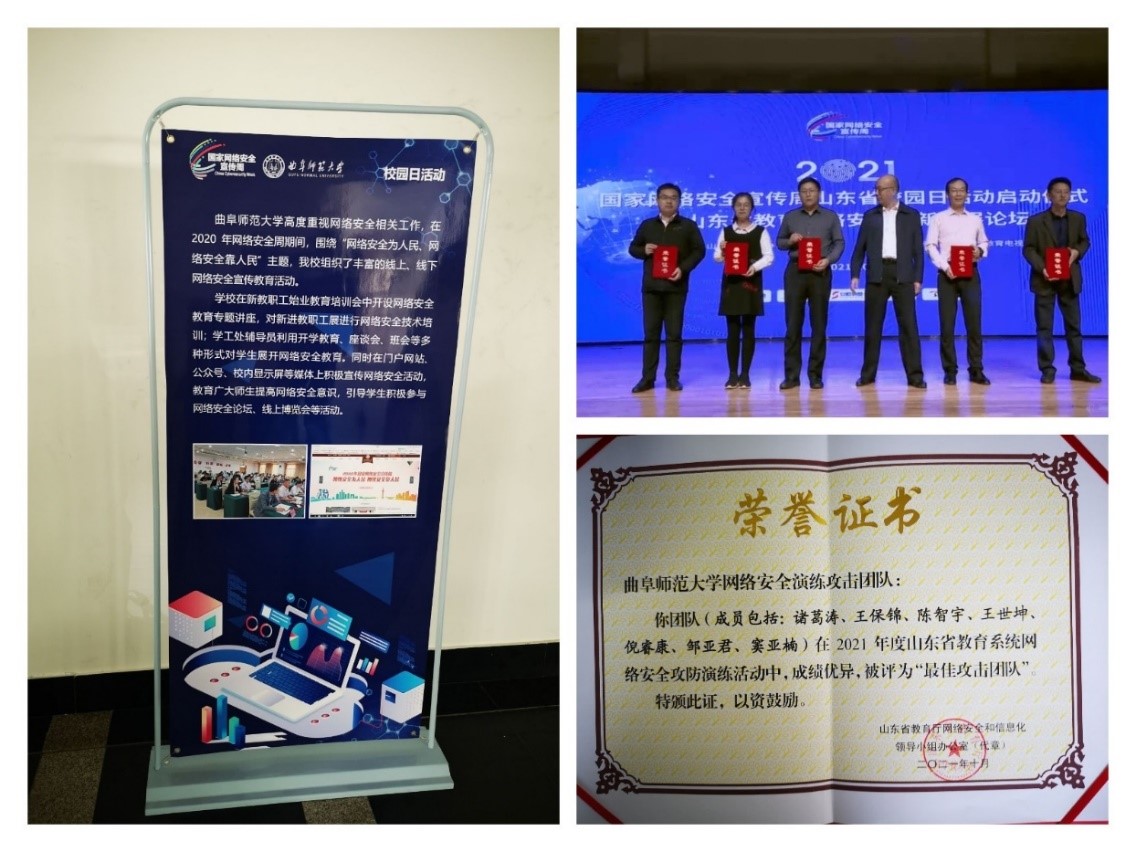 参加网络攻防演练提升保障能力,在2021年度山东省教育系统网络安全攻防演练活动中,万象城手机网页版登录入口网络信息中心组织的网络安全演练攻击团队被评为“最佳攻击团队”,受邀出席2021年国家网络安全宣传周山东省校园日活动,面向全省教育行业同仁,做了“高校网络安全的平衡之道”专家报告。通过对抗、复盘和研讨,更加完善了安全事件的监测发现能力和应急处置能力,稳步提高了网络安全风险意识。