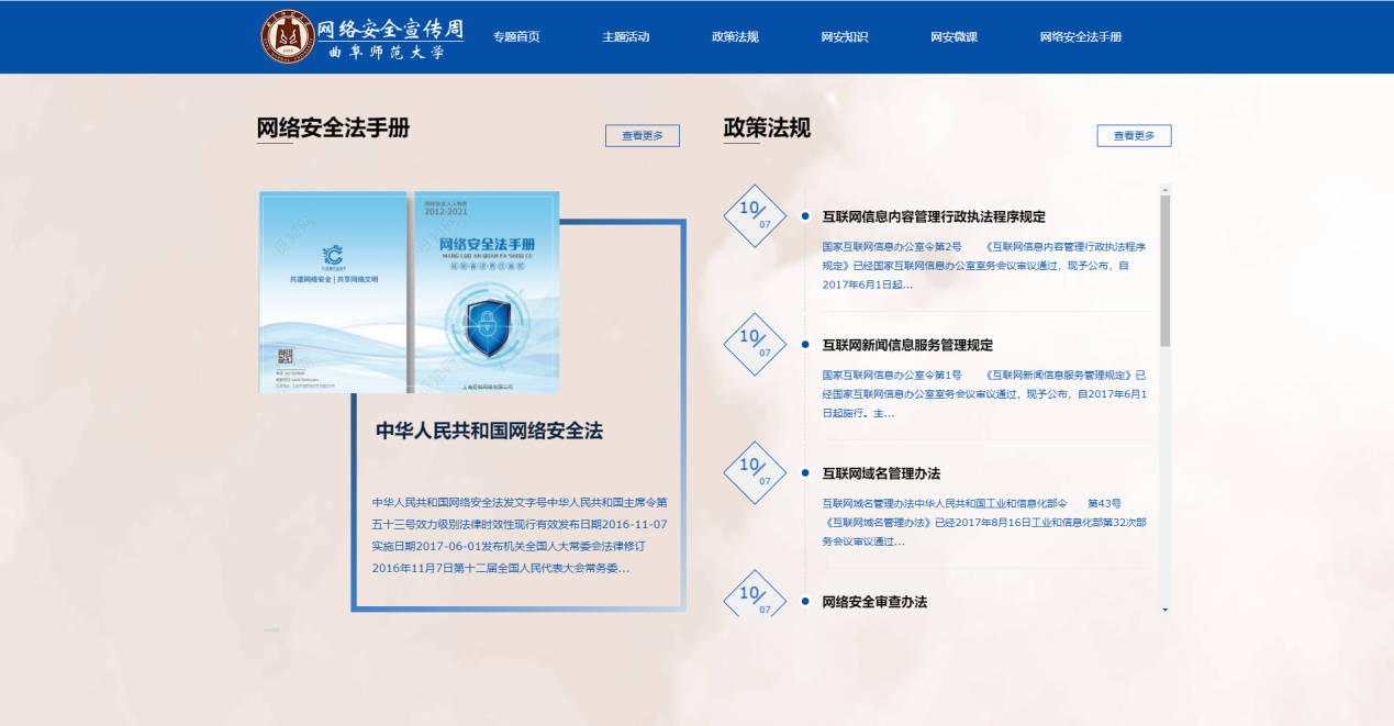 筹划并上线万象城手机网页版登录入口2021国家网络安全宣传周专题网站(https://wlaqxcz.qfnu.edu.cn/),普及《网络安全法》和《数据安全法》等法律法规及政策文件,扎实推进国家网络安全宣传工作。