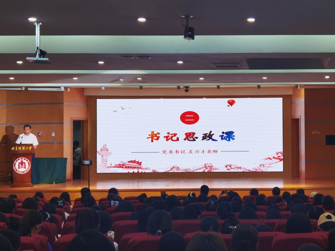 曲阜师大新闻中心讯 9月29日晚,文学院 “建党百年,青年担当”——2021级新生思政大课堂在孔子会堂开讲。文学院党委书记左兴才、党委副书记曲媛媛、团委书记张乾坤、新生辅导员杨景添、高原以及2021级全体同学参加了本次活动。