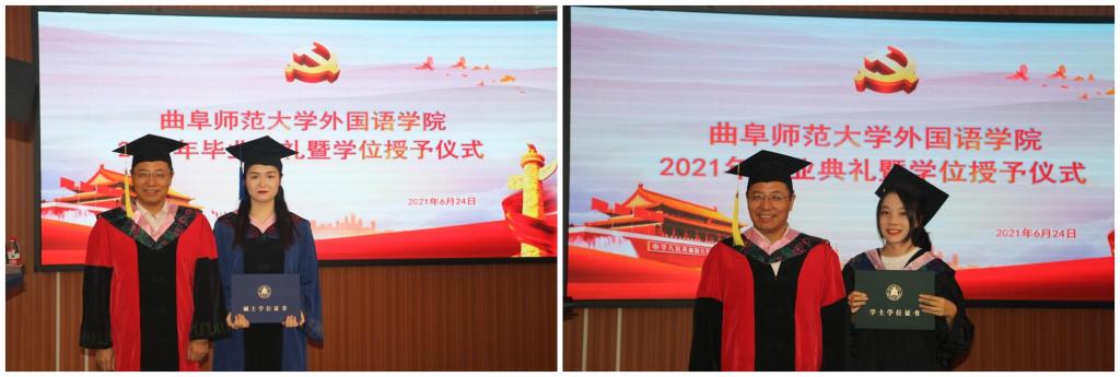 曲阜师大新闻中心讯(通讯员:李宜洳 摄影:张金霞 苗苑铭 徐淑恒)华章赓续,骊歌再响。心怀家国,扬帆远航。又是一年毕业季,珍藏着师长和同窗的深深祝福,2021届毕业生即将踏上崭新征程。6月24日下午,万象城手机网页版登录入口外国语学院举行2021年毕业典礼暨学位授予仪式。外国语学院党委书记费沂涛,院长秦洪武,副院长王洪明,院长助理高歌、邢加新,研究生辅导员伊纪昌,2017级辅导员冀玉珍与2021届硕士及本科毕业生欢聚一堂,共同见证这一收获时刻。典礼由外国语学院党委副书记王作茂主持。