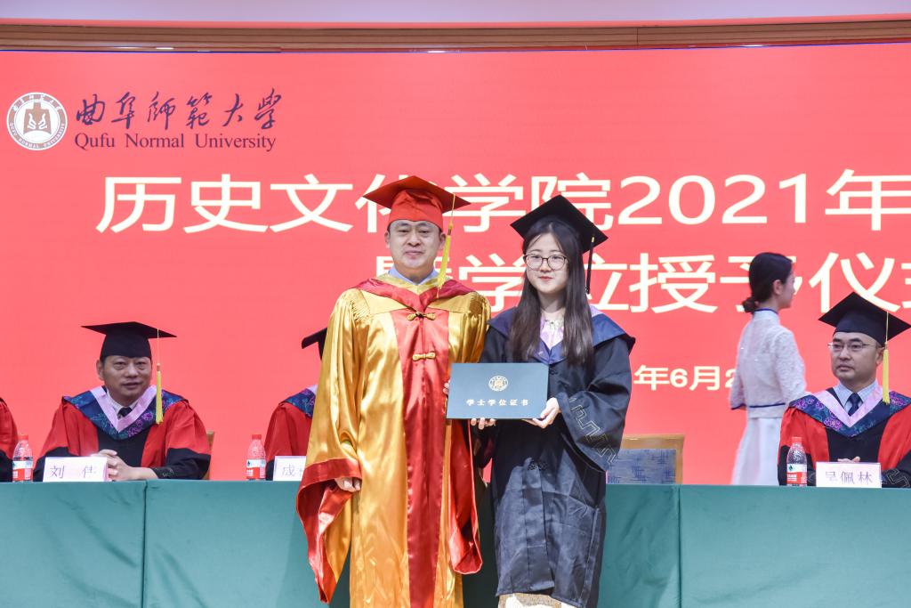 曲阜师大新闻中心讯 六月芳华,曲园骊歌。6月25日上午,历史文化学院2021年毕业典礼如期举行,学校党委书记、博士生导师戚万学教授应邀出席典礼并为毕业生代表拨穗正冠、颁授证书。384名本科生和60名硕士研究生如约齐聚孔子会堂,共赴这场曲园青春之约。学校党委办公室负责人、学院领导班子、博士生导师、教师代表、家长代表共同参加典礼。学院副院长吕厚轩主持典礼,副院长王京传教授宣读了关于授予学位的决定。