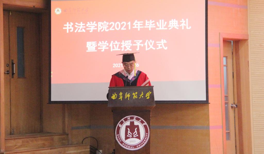 曲阜师大新闻中心讯(通讯员:薛翠)6月26日上午九点,书法学院2021年毕业典礼暨学位授予仪式在我校孔子会堂隆重举行。学院党委书记院长刘建新、副院长陈涛、院长助理乌峰、徐传法,及学院各教研室主任、各年级辅导员、2021届毕业生和在校学生代表共同出席。典礼由学院党委副书记胡乃永主持。