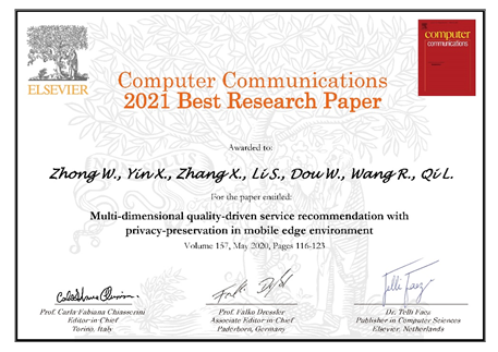 曲阜师大新闻中心讯(通讯员:毕文波)  近日,计算机通讯领域知名国际期刊《Computer Communications》公布了一年一度的最佳研究论文奖。曲阜师大计算机学院2018级硕士研究生仲伟艺为第一作者(通讯作者为齐连永)的论文《Multi-dimensional Quality-driven Service Recommendation with Privacy-preservation in Mobile Edge Environment》从该期刊去年发表的600余篇论文中脱颖而出,荣获2021年度唯一一篇“最佳研究论文奖”(2021 Best Research Paper Award)。