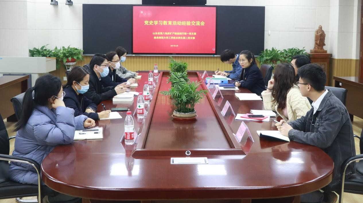阜师大新闻中心讯(通讯员:张华)为提升党建工作水平,加强支部间党史学习教育的经验交流,4月20日下午,曲阜师大工学院本科生第二党支部与山东省第八地质矿产勘查院(日照)行政一党支部开展联学共建活动。行政一党支部书记胡甲齐等5名同志、本科生第二党支部全体党员参加,本科生第二党支部书记王凯主持活动。