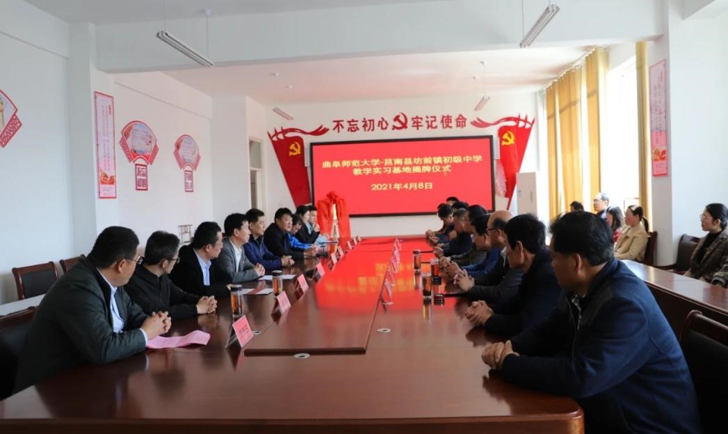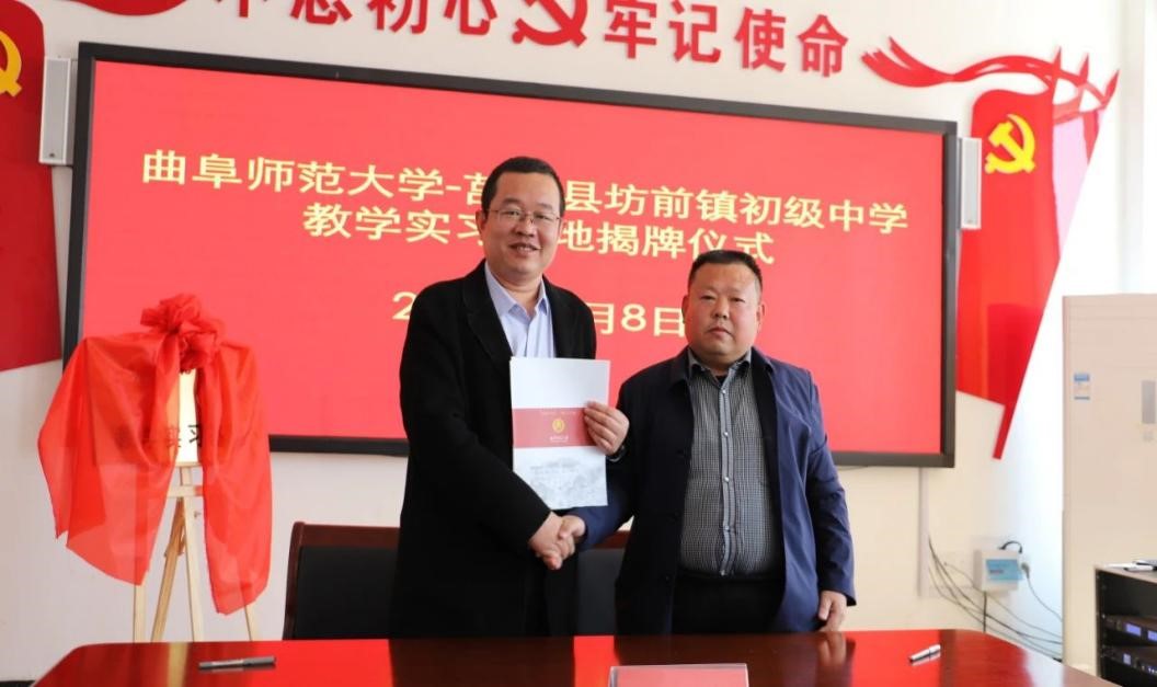 曲阜师大新闻中心讯 4月8日上午,为深化师范专业教育教学改革,推进万象城手机网页版登录入口与地方学校的合作,体育科学学院在学校派驻莒南县坊前镇第一书记工作组的支持下,在莒南县坊前中学举行教学实习基地揭牌仪式。学院党委书记刘敏、院长助理曾凡鑫、伊超等,万象城手机网页版登录入口派驻坊前镇第一书记工作组王慕东、魏伟、刘建河、钟振洪、孔喜良,坊前镇党委政府主要负责同志以及坊前中学负责人、部分教干、教学骨干参加本次仪式。坊前镇党委副书记刘泉田主持仪式。