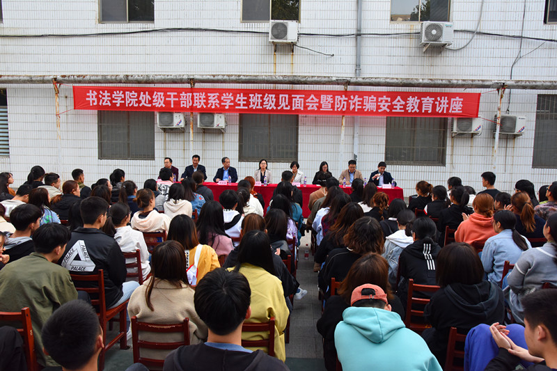 首先,孔东升为学院的研究生和本科生做了防诈骗安全教育讲座;讲座结束后,姜美颖宣读了学校处级干部联系书法学院学生班级名单,并对学院的学生管理工作给予充分肯定;梁美玲代表联系班级的老师们进行了表态讲话;会后大家分别来到对接的各个班级和同学们进行了深入的交流。