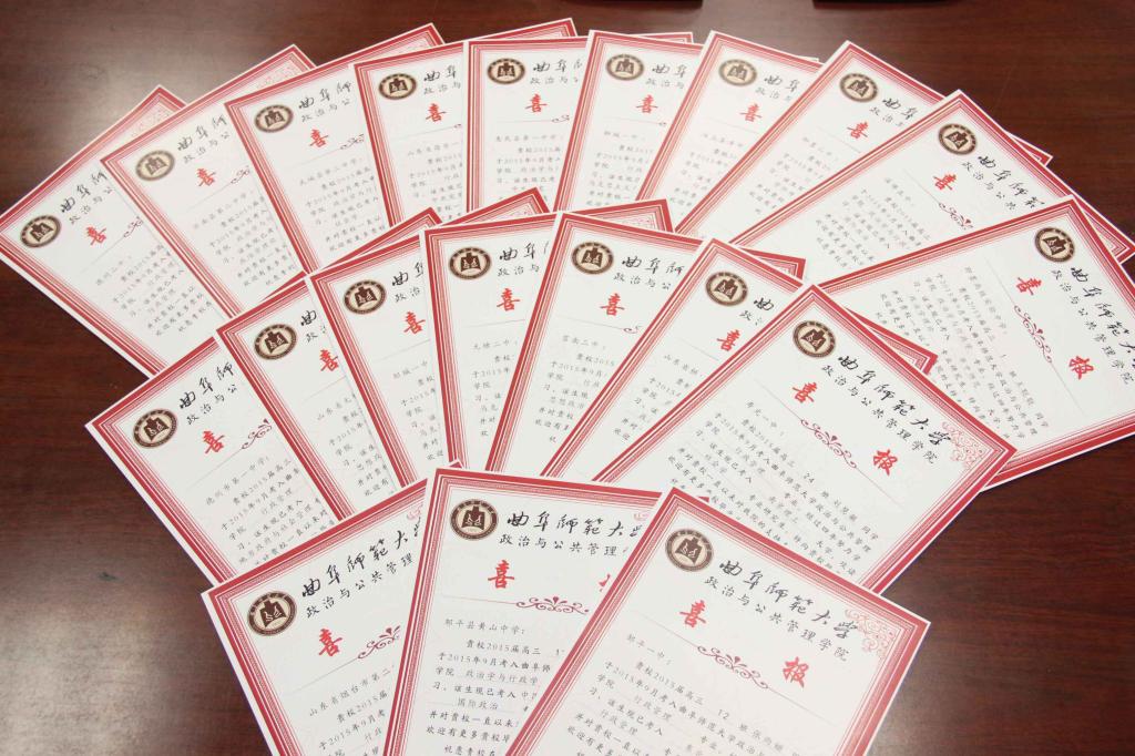 近日,为表彰优秀学生,树立榜样激励作用,加强与生源学校之间的沟通联系,共同努力将学生培养成为全面发展的优秀人才,政治与公共管理学院开展了向考取硕士研究生的同学的高中母校寄送喜报活动,将这些优秀学生的相关情况通报其高中毕业学校,共同分享收获的喜悦。