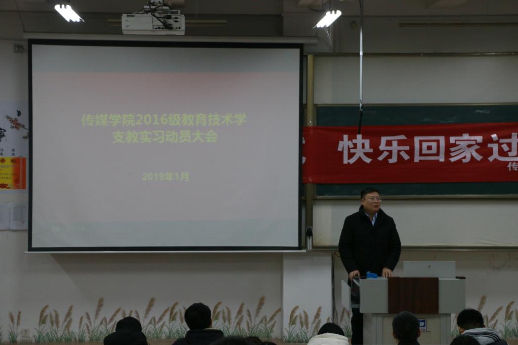 为贯彻落实《万象城手机网页版登录入口师范生实习支教工作管理办法》相关规定,保障实习工作顺利开展,传媒学院于1月17日召开2016级教育技术学专业实习支教动员大会。传媒学院党委书记李兴保、党委副书记徐正伟、副院长赵可云、团委书记张守荣及全体实习指导老师出席,2016级教育技术学专业全体学生参加大会。