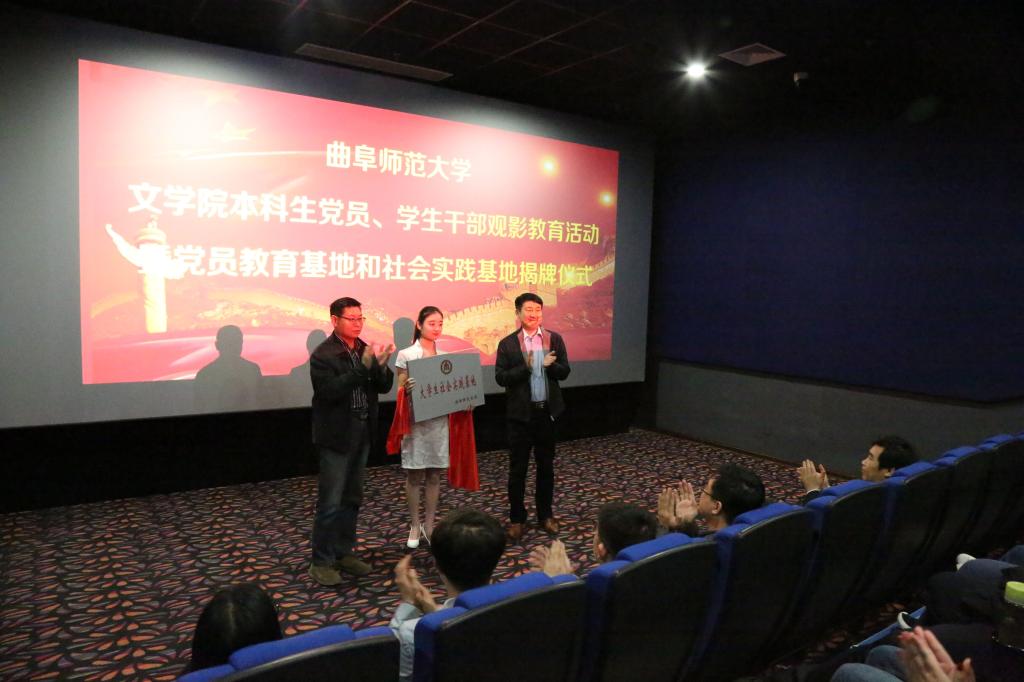 2018年是文学院谋划“十三五”蓝图的关键年,文学院紧紧围绕学校党建工作的总体要求,深入学习贯彻党的十九大精神,围绕立德树人根本任务,找准党建工作与教育教学工作的结合点,为推进学院的改革和发展提供强有力的思想保证和组织保证。3月28日下午,文学院在曲阜顺和大地影视城举行文学院学生党员、学生干部观影教育活动暨党员教育基地、社会实践基地揭牌仪式,并共同观看党性教育片《厉害了我的国》。校团委书记宋国栋、文学院党委书记苏占兵、党委副书记王作茂等出席活动。