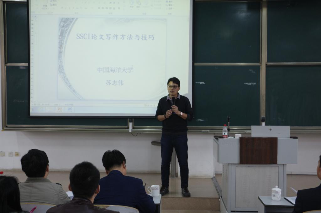 3月30日下午2:30,繁荣哲学社会科学人才工程特聘教授、博士生导师、教育部新世纪人才、中国海洋大学经济学院苏志伟教授来我校作了主题为《“SSCI论文写作方法及技巧”》的学术报告。本场报告会由经济学院副院长刘刚主持,院长杜曙光与台湾大叶大学梁晋嘉教授出席讲座,众多师生前来交流学习。