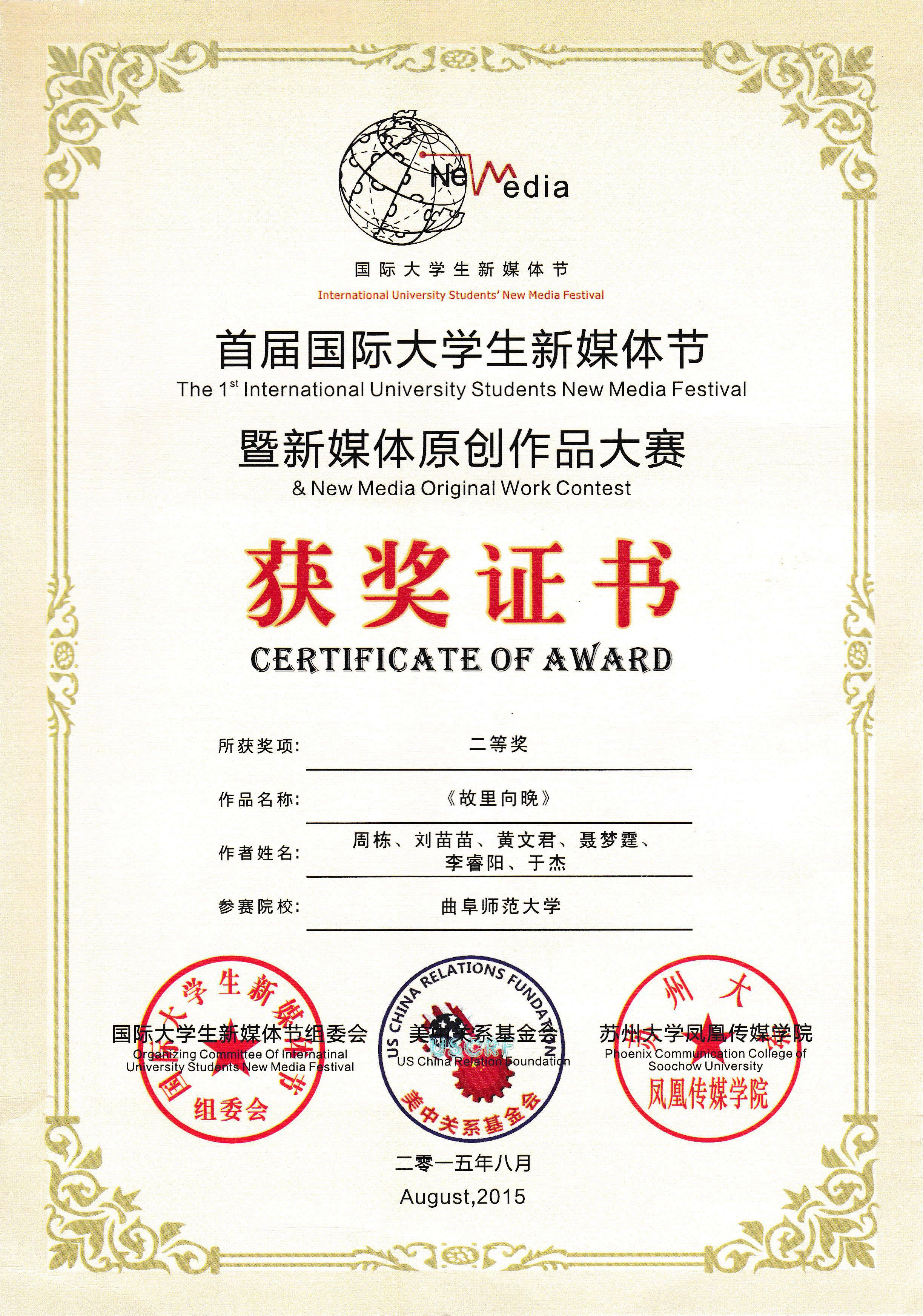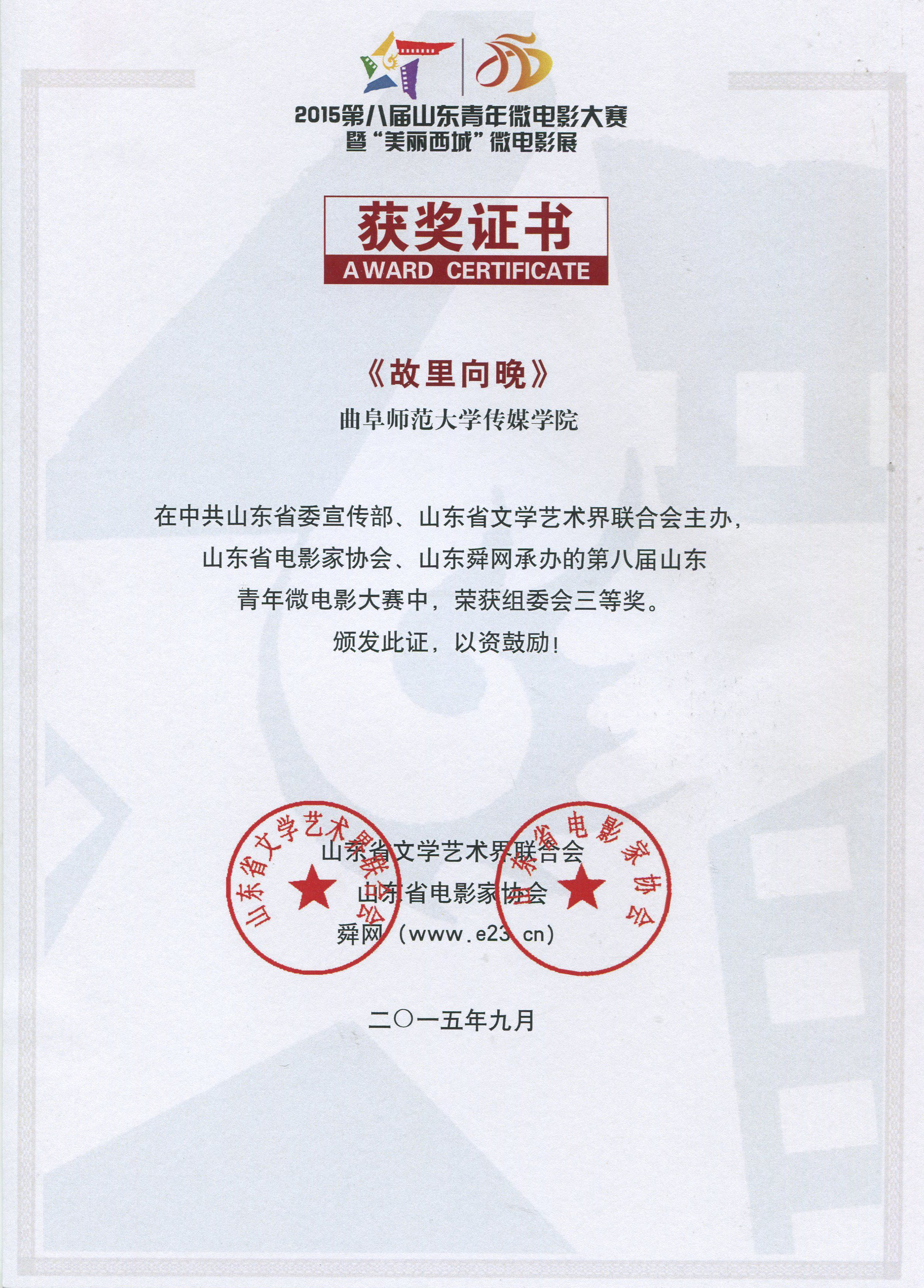 《故里向晚》是一部以孔子故里曲阜为背景,通过两个时空的交叉,讲述了一个儿探母,母盼儿,儿归故乡,母已不在的故事,表达了“子欲养而亲不待”的主题。《故里向晚》从各大比赛中脱颖而出,是对我校传媒学院应用型人才培养和实践教学改革的充分肯定,同时展现出了传媒学院学生的专业素养、精于合作的团队观念。