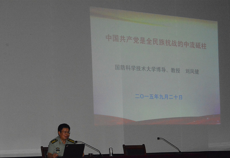 9月19日下午、20日上午,国防科技大学教授、博士生导师、全国道德模范刘凤健大校在曲阜校区大学生活动中心为新生军训团做了两场题为“中国共产党是全民族抗战的中流砥柱”的军事教育报告。学生工作处(武装部)副处长王志华教授主持报告会。