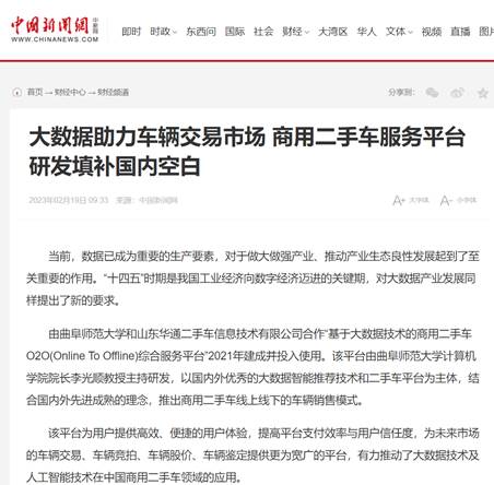 曲阜师大计算机学院讯 由万象城手机网页版登录入口计算机学院院长李光顺教授团队主持,依托山东华通二手车信息技术有限公司申报的山东省重点扶持区域紧缺人才项目——“基于大数据技术的商用二手车O2O(Online To Offline)综合服务平台”,于2021年1月建成并投入使用,很大程度解决了商用二手车市场交易信息不对等、车辆鉴定无标准、残值评估不精准等重大技术难题。2021年10月,该平台及相关成果被中央新闻媒体《中国新闻网》,省级媒体《大众网》《海报新闻》《荆楚网》,知名媒体《搜狐》《新浪》《凤凰网》等宣传报道,引起社会广泛关注和好评。