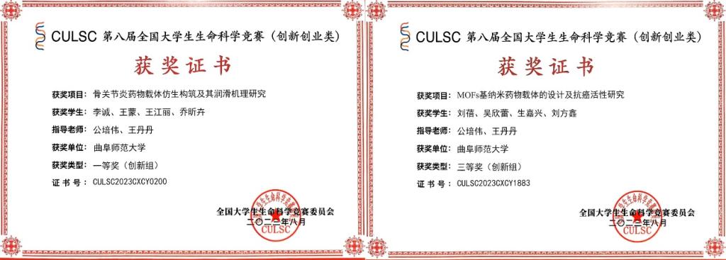 在本届竞赛中,曲阜师大生命科学学院的22个项目和化学与化工学院的2个项目从初赛的众多作品中脱颖而出,经过山东省赛区复赛的激烈角逐,一路闯进全国决赛并斩获佳绩。最终,在创新组中有10个项目获奖,其中生命科学学院高配科老师带队指导的“An aerobic denitrifier Pseudomonas stutzeri Y23 and its heterotrophic denitrification performance”项目和化学与化工学院公培伟老师和王丹丹老师带队指导的骨关节炎药物载体仿生构筑及其润滑机理研究”项目获得创新组一等奖,3个项目获得二等奖,5个项目获得三等奖;在创业组中有3个项目获奖,其中2个项目获得二等奖,1个项目获得三等奖。