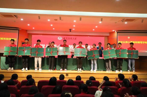 随后,出席活动的领导老师为2023级新生代表颁发了从师小黑板和钢笔字帖,并希望同学们能够珍惜学院的厚爱和良苦用心,充分用好每一块黑板、每一页字帖,狠抓基础、积极练习,为提高专业技能而不懈努力,展现新时代师范生“书写规范汉字,传承中华文化”的专业特色。